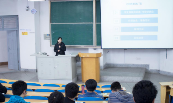 讲座从学生面临的困惑(就业或考研)、认识自我、案例分析和提升自我四个部分进行了深入浅出的讲解。吴老师首先针对在座大三学生面临的诸多困惑和选择进行的详细的分析,对于考研她强调需要综合考虑经济、专业兴趣、就业前景、课程基础等因素来做决定,考研的最终目标是积极进取而非逃避现实。她还指出考研过程中的注意事项,例如做好充分的心理准备,把考研纳入人生规划来认识,给自己一个准确定位等。对于就业的同学,她分析了就业的十大影响因素,包括职业、兴趣、技能、目标、平衡、工作环境等,指出就业的同学应该要有一个合理的自我定位,认真考虑第一份工作,保持良好心态。