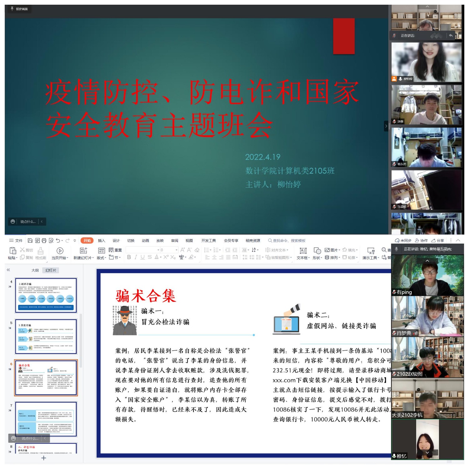 围绕反电信网络诈骗,永利集团官网还将疫情防控、国家安全日等安全教育内容纳入班会之中。同学们通过国家安全教育云基地数字资源,集中学习了国家安全相关知识,进一步提高了同学们的国家安全意识与保密意识。在疫情防控教育中,同学们共同学习了第五版疫情防控技术方案,大家纷纷表示,会以主人翁的意识,共同维护校园安全,努力创建零疫情校园。