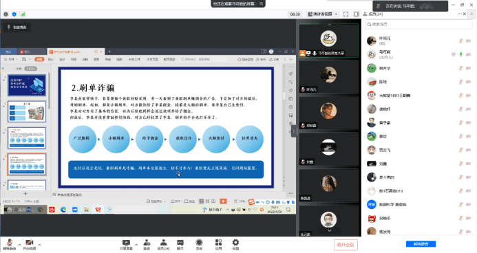 班会上,各班主讲人详细地介绍了几种传统的电信网络诈骗,如杀猪盘,刷单诈骗,贷款诈骗等,普及了一些新型的诈骗手段,如游戏诈骗,街头采访诈骗等。通过分析不同类型的网络诈骗案例,主讲人带领同学们学习了防电信网络诈骗知识,引导同学们学会如何在互联网中保护好个人信息和财产。对于如何有效防范网络诈骗,主讲人强调,在网络中要做到六个“一律”与八个“凡是”,并呼吁全体同学安装反诈骗app,以不断提高个人的反诈能力,增强防骗意识。