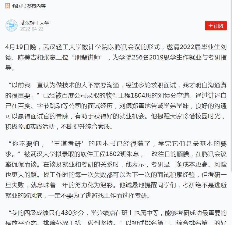 4月19日晚,永利集团88304官网集团永利集团88304官网集团以腾讯会议的形式,邀请2022届毕业生刘德、陈美吉和张意三位“朋辈讲师”,为学院256名2019级学生作就业与考研指导。
