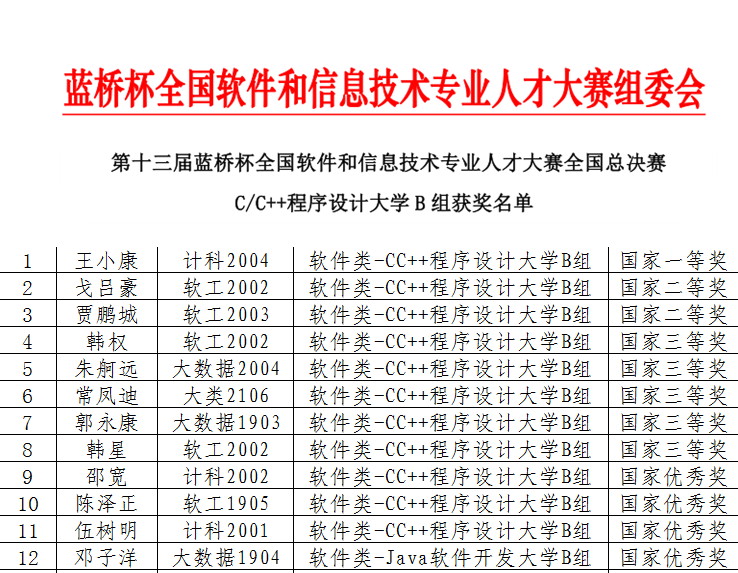 6月27日,第十三届“蓝桥杯”全国总决赛成绩揭晓,永利集团官网学生在Java软件开发和C/C++程序设计两个组别的比赛中喜获佳绩。其中,全国一等奖1名,全国二等奖2名,全国三等奖5名,全国优秀奖4名。