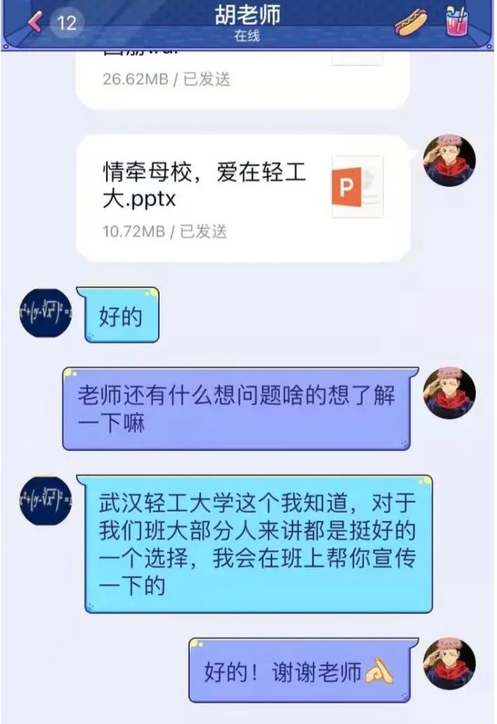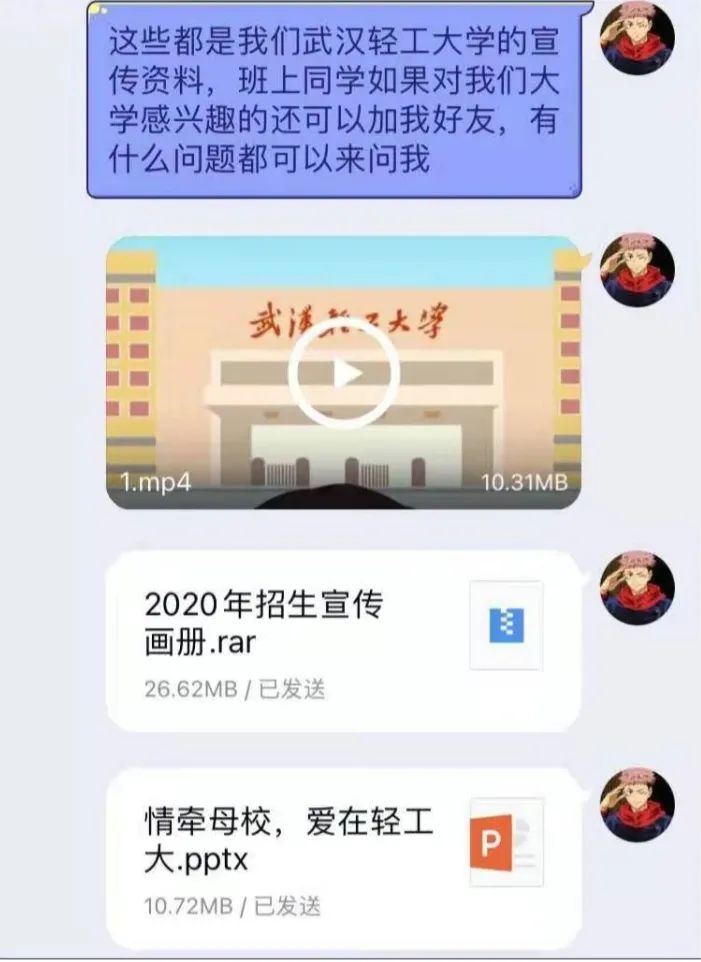 为响应学院“我把最美轻工大带回母校”活动的号召,2021年2月4日,我与高中班主任取得联系。基于学校的疫情防控要求,我将宣传小组制作的PPT、永利集团88304官网集团2020年招生宣传视频,以及招生简章打包发送给老师,由老师在班级中进行宣传。