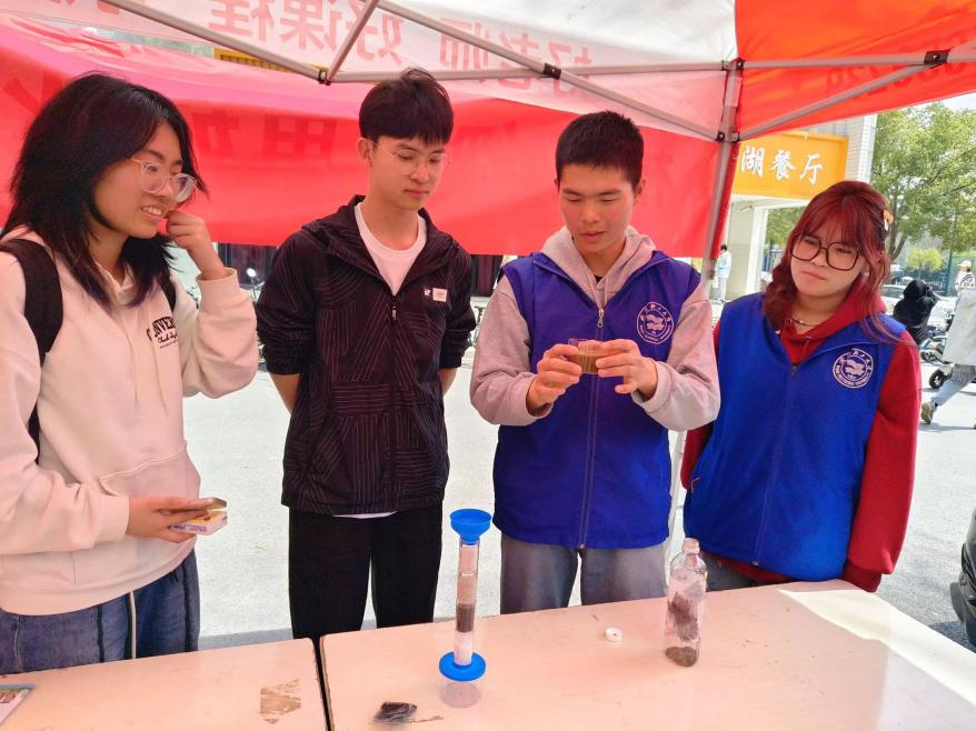 “好神奇,这么浑浊的泥水经过这几层装置就变得清澈了起来!”金湖餐厅门口的外场上,围观的同学看到志愿者乐得志的过滤装置演示发出声声惊叹,原来是泥水经过花岗岩、瓷沙、活性炭等材料的过滤带走了水中的杂质。