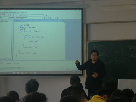 袁操老师就C语言三种循环语句for,while,do while先进行对比,总结出三种语句之间的区别,然后用这三种循环语句分别实现阶乘运算,让同学们理解三种循环语句在具体实现时应该注意的主要内容;再通过一个通俗有趣的问题引入多重循环的概念,并对多重循环的程序设计方法进行了详细的讲解,并举例说明多重循环语句所应该注意的有关事项;最后提出几种多重循环语句的典型写法。课堂上,袁操老师将C语言程序设计与趣味问题结合在一起,使程序设计方法及其算法自然切入,内容通俗易懂,增强学生学习C语言程序设计兴趣,也使同学们明白完成一个相对复杂程序的设计方法,以及如何验证程序的正确性。