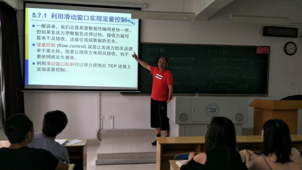 本课堂讲授的是《计算机网络技术》,专业基础课,第五章 运输层 第七节 TCP流量控制。 首先桂老师简要回顾了上一节课讲授的主要内容: TCP可靠传输的实现方法--以字节为单位的滑动窗口技术,然后通过提出问题--如何让发送数据方发送速率不要太快且要让接受方来得及接收,否则会有数据丢失,自然引出TCP的流量控制的有关概念以及其必要性和具体实现方法--利用滑动窗口实现流量控制。并通过案例分析详细讲解了流量控制的具体方法和实现细节。然后是提问与讨论环节10分钟,该流量控制方法的是否存在缺点?如何解决?经过大家热烈讨论,发现TCP连接有可能发生死锁!如何避免和解除死锁?有同学提出可行的方法--为TCP连接设置持续计时器,就可以有效的避免和解除死锁的发生!最后桂老师对讲课内容进行了简要总结,讲课圆满结束。