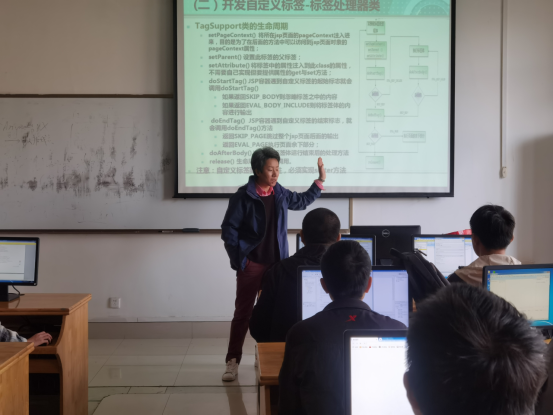 20201026日,软件工程教研室教师观摩丁月华老师的《Web程序设计》课堂教学。本次课程授课内容为JSP自定义标签和标准标签库,丁月华老师通过案例引入的方式详细说明了JSP自定义标签的开发方法,通过代码示例深入浅出地说明了标准标签库的outsetremoveifchoosewhenotherwiseforEachforTokens等重要标签用法,让学生深入了解JSP标签简化JSP代码的作用。此外,丁月华老师利用超星学习通开展电子签到提高课堂管理效率,同时使用课堂练习等互动环节巩固学生知识的掌握。