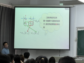 为迎接学校期中教学检查,2022年4月15日上午第三节课在科教楼305教室,永利集团88304官网集团公共数学教研室开展了1次教学公开课活动,由连续多次获得“永利集团88304官网集团教学质量一等奖”获得者刘朔老师为大家展示了一场特色鲜明的教学活动。本次教学内容为经济数学2课程中线性代数部分行列式的展开,刘朔老师对这堂课进行了很好的设计,通过二阶和三阶行列式的计算,运用启发式教学方法,带领同学们体会如何将高阶行列式转化成低阶行列式进行计算,融入思政元素如何把复杂问题简单化,深入浅出处理问题。他讲课声音抑扬顿挫,能很好地吸引学生的注意力;他的板书工整规范,设计合理;他能把控课堂气氛,很好地与学生互动,把枯燥难懂的数学概念一步步呈现给学生。