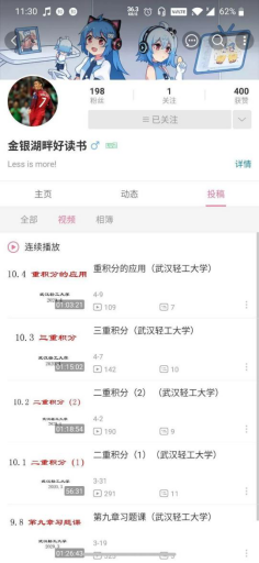 在当代大学生中非常流行的视频网站——哔哩哔哩(简称B站)上,有这样一位UP主,取名“金银湖畔好读书”,从他的主页可以发现这个账号注册时间应该不长,今年2月18日才开始上传第一个视频。但是,短短两个月的时间却已经陆续上传了16个视频,收获了198个粉丝,400个点赞。每个视频都是关于高等数学知识的专业讲解,免费向网民开放,可谓“干货满满”“诚意十足”。