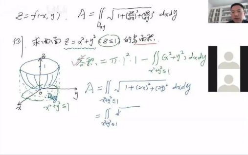 程老师在授课的过程中主要使用的是共享白板这个功能,它可以非常流畅地在屏幕上书写,学生端在听课的过程可以随时在白板上画出有疑问的地方,教师端也可以随时对学生进行提问,这样非常方便师生互动,上课的场景跟在真实的教室上课很接近。高等数学这门课程作为一门大学数学的基础课程,在讲授的过程中需要有一定量的推导演算,这种实时共享白板的功能可以很好的发挥它的功能,它就相当于教室里的黑板,甚至比真实的黑板还好用,比如笔的颜色更加多样化非常适合标记,每次课结束前可以通过翻页从头开始对当堂课内容作总结回顾。