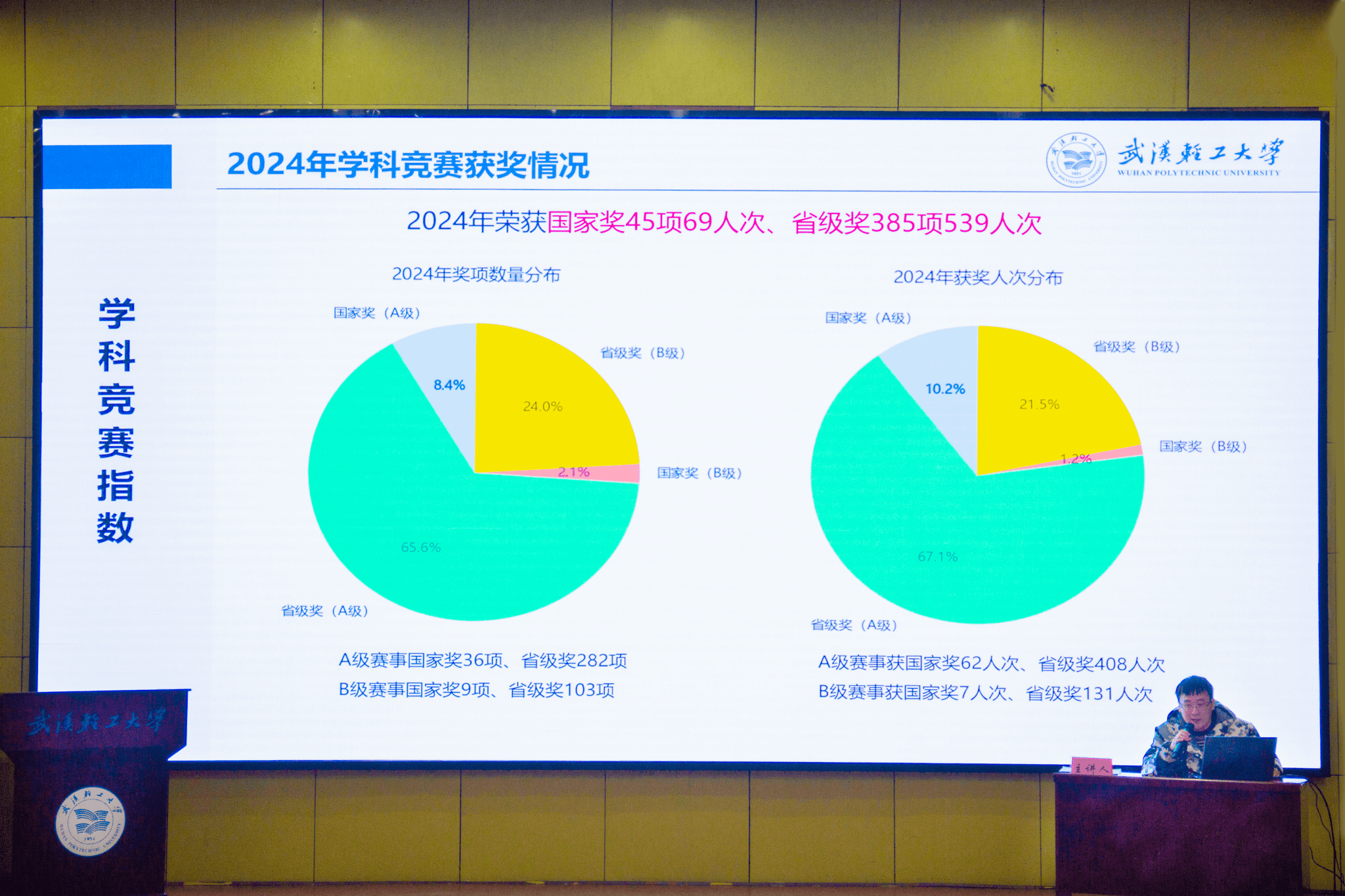 “过去一年,在全院师生共同努力下,学院荣获国家奖45项69人次、省级奖385项539人次,学科竞赛指数连升两档!”学院竞赛管理系统负责人余琛向师生们展示了一年来的各项学科竞赛获奖情况,首次发布了永利集团88304官网集团学科竞赛指数,并公布了2024年度学科竞赛教师排行榜和学生排行榜。