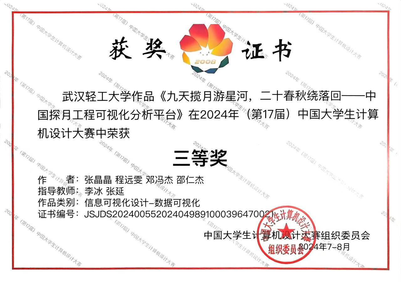 3 | 九天揽月游星河,二十春秋绕落回——中国探月工程可视化分析平台 | 张晶晶、程远雯、邓冯杰、邵仁杰 | 李冰、张延 | 省一等奖 |